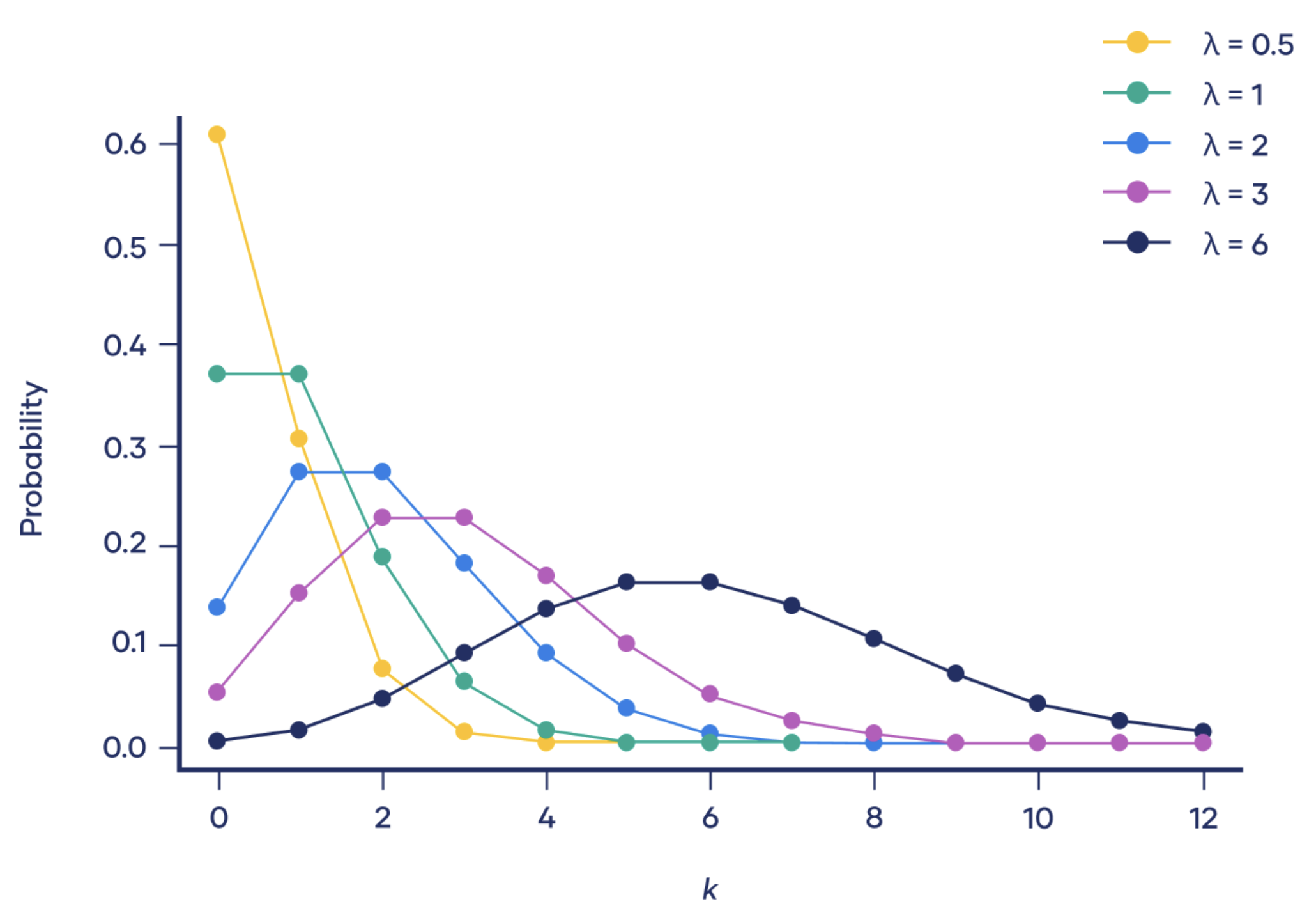 \[\mathbb{P}(X=x)=\frac{\lambda^x}{x!}e^{-\lambda}\]$\lambda$ is the expected rate of occurence of the events. In practice, it’s often estimated from past events.